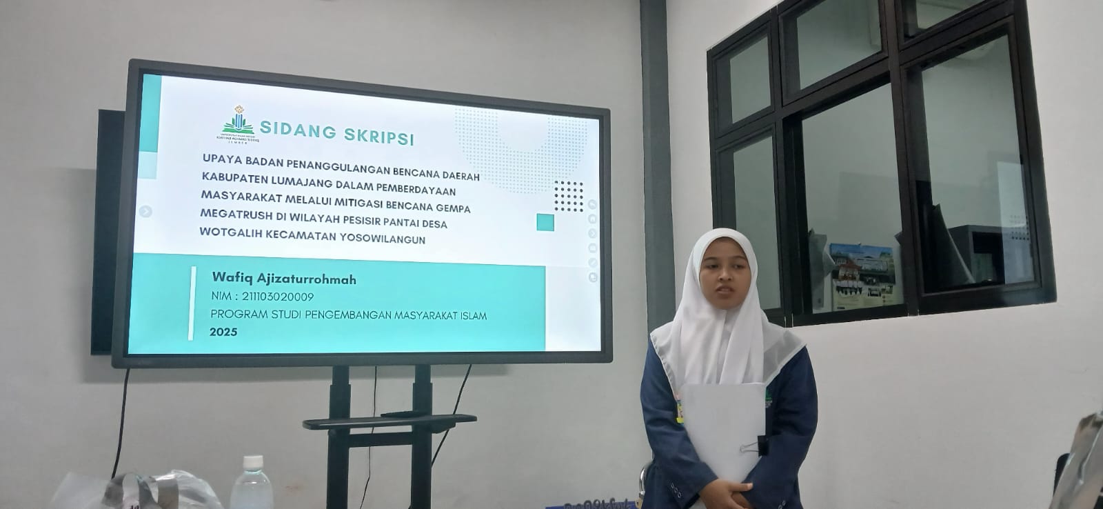 Jember – Mahasiswa Program Studi Pengembangan Masyarakat Islam (PMI), Fakultas Dakwah, UIN Kiai Haji Achmad Siddiq (KHAS) Jember, Wafiq Ajizaturrahmah, mengikuti ujian skripsi pada Kamis, 19 Juni 2025. Dalam ujian tersebut, Wafiq mempresentasikan hasil penelitiannya yang berjudul “Upaya Badan Penanggulangan Bencana Daerah (BPBD) Kabupaten Lumajang dalam Pemberdayaan Masyarakat melalui Mitigasi Bencana Gempa Megathrust di Wilayah Pesisir Pantai Desa Wotgalih, Kecamatan Yosowilangun.”